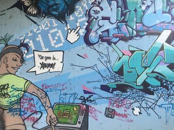 Keywords: colorful comic graffiti street art sprayer art spray stone wall facade paint wall structure creativity painted wall mural turquoise facade color urban art youth graphically