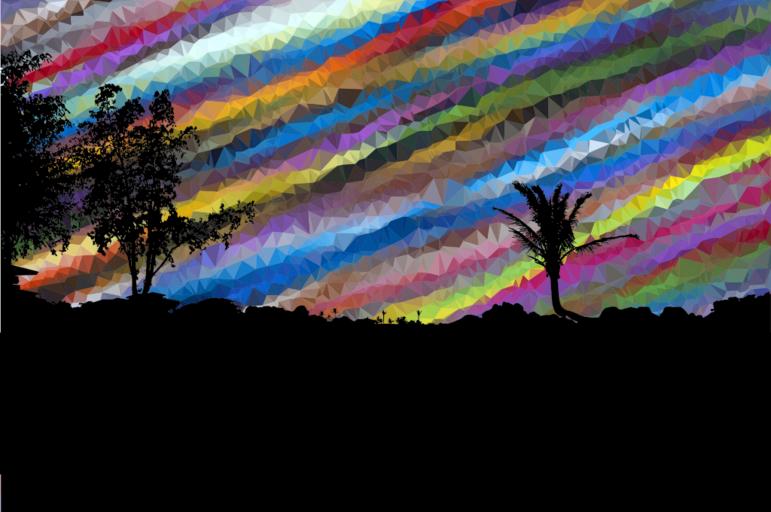 Keywords: colorful prismatic chromatic rainbow low poly polygon triangles abstract geometric art maui hawaii sunset silhouette landscape trees tropical psychedelic