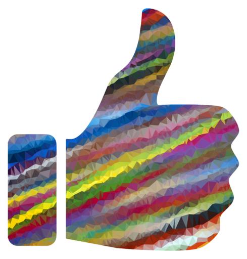 Keywords: colorful prismatic chromatic rainbow low poly polygon triangles abstract geometric art thumbs up hand approve like encourage agree condone gesture vector svg