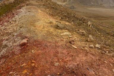 | Keywords: valley of ten thousand smokes valleyoftenthousandsmokes soil outdoor landscape The Valley is covered with mineral deposits that mark the location of extinct fumaroles. Black staining around these spots typically reflect magnetite or hematite. White zones may be enriched in silica and clay minerals. Orange to yellow staining indicates minerals such as limonite, geothite, or sulfur. NPS photo by M. Fitz. The Valley is covered with mineral deposits that mark the location of extinct fumaroles. Black staining around these spots typically reflect magnetite or hematite. White zones may be enriched in silica and clay minerals. Orange to yellow staining indicates minerals such as limonite, geothite, or sulfur. NPS photo by M. Fitz. |