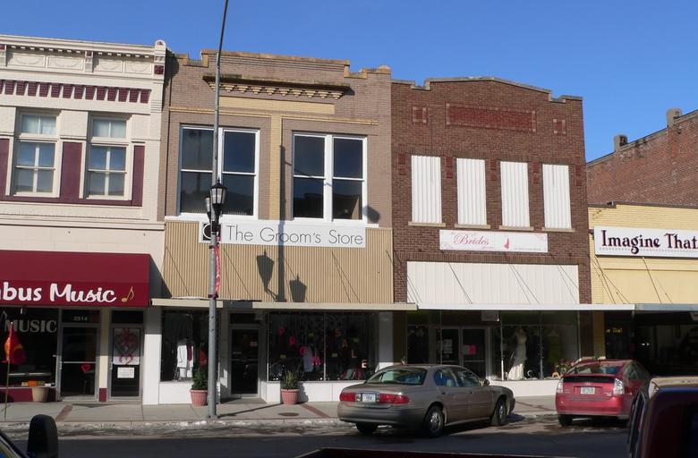 | Keywords: Columbus, Nebraska 2510-2512 13th St.JPG Columbus Nebraska The block is part of the Columbus Commercial Historic District which is listed in the National Register of Historic Places The building partly visible at right with the Imagine That sign is the former LaBook Ladies Shop at 2508 13th St built ca 1923 The dark brick building beside it with the four white upper windows is the J W Weaver building at 2510 built in 1919 The building beside it The Groom's Store is the former Reece Shoe Co at 2512 built ca 1913 The leftmost building with Columbus Music on the awning is the Hansen Building at 2514 built ca 1914 All four buildings are contributing properties in the Historic District own Ammodramus 2010-02-12 Pictures by Ammodramus Taken with Panasonic Lumix DMC-FZ20 Columbus Commercial Historic District Built in Nebraska in 1913 Built in Nebraska in 1914 Built in Nebraska in 1919 Built in Nebraska in 1923 Shops in Nebraska Brick buildings in Nebraska |
