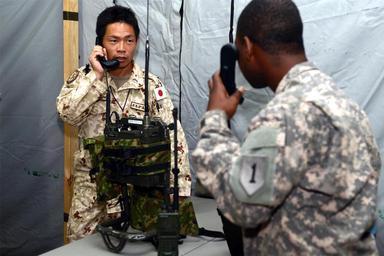 | Keywords: Combined Joint Task Force-Horn of Africa 130705-N-IZ662-400.jpg en Japan Ground Self-Defense Force Sgt 1st Class Yasuyuki Iwashita left and U S Army Sgt Roderick Brown the communications section chief with the 1st Battalion 63rd Armor Regiment 2nd Armor Brigade Combat Team 1st Infantry Division test radio equipment July 5 2013 at Camp Lemonnier Djibouti U S and Japanese service members met to develop an emergency communications system to use in the event of a disaster Iwashita was assigned to the Japan Self-Defense Force Deployment Air Force for Counterpiracy Enforcement unit a Combined Joint Task Force-Horn of Africa coalition partner U S Navy photo by Mass Communication Specialist 1st Class Tom Ouellette/Released 2013-07-05 Petty Officer 1st Class Thomas Ouellette https //www dvidshub net/image/974967 130705-N-IZ662-400 2013-07-18 23 47 CAMP LEMONNIER DJ PD-USGov-Military-Navy Combined Joint Task Force - Horn of Africa Camp Lemonnier Images from DoD uploaded by Fæ People of the JGSDF |