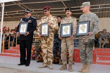 | Keywords: Combined Security Force Graduates DVIDS252808.jpg en Maj Gen Jamal Taher Bakr provincial director of police Brig Gen Abdul Amir Hassan division deputy commander Iraqi Army Brig Gen Shirko Fatih Schiwani representative for the Kurdistan Regional Government and Maj Gen Anthony A Cucolo III commanding general 3rd Infantry Division present their Golden Lion plaques during the Combined Security Force Graduation Ceremony at the Kirkuk Training Center in Kirkuk Iraq Feb 15 The CSF is a unit comprised of U S Kurdish and Iraqi personnel designed specifically to increase security during the election process 2010-02-15 Petty Officer 1st Class matthew leistikow https //www dvidshub net/image/252808 100215-N-+++++-627 2010-02-19 21 03 KIRKUK IQ PD-USGov-Military-Navy Kirkuk Training Center 3rd Infantry Division United States Images from DoD uploaded by Fæ |