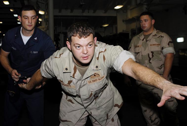 Keywords: Combined Task Force 151 - 090115-N-5244H-054.jpg en 090115-N-5244H-054 GULF OF ADEN Jan 15 2009 Quartermaster 3rd Class Dan Apollo left from St Louis Mo handcuffs Coast Guard Petty Officer 3rd Class Chris Wimsatt from Stockton Mo during boarding team apprehension training in the well deck of the amphibious transport dock ship USS San Antonio LPD-17 as Coast Guard Petty Officer 3rd Class William Arocho from Miami looks on San Antonio is the flagship for Combined Task Force CTF 151 a multinational force conducting counter-piracy operations to detect and deter piracy in and around the Gulf of Aden Arabian Sea Indian Ocean and the Red Sea It was established to create a lawful maritime order and develop security in the maritime environment U S Navy photo by Mass Communication Specialist 1st Class Monique K Hilley/Released http //www navy mil/management/photodb/photos/090115-N-5244H-054 jpg Official U S Navy Photograph - http //www navy mil/view_image asp id 68072 090115-N-5244H-054 jpg Mass Communication Specialist 1st Class Monique K Hilley USN 2009-01-15 PD-USGov-Military-Navy Combined Task Force 151 Military in the Horn of Africa Piracy in Somalia Well decks People in handcuffs |