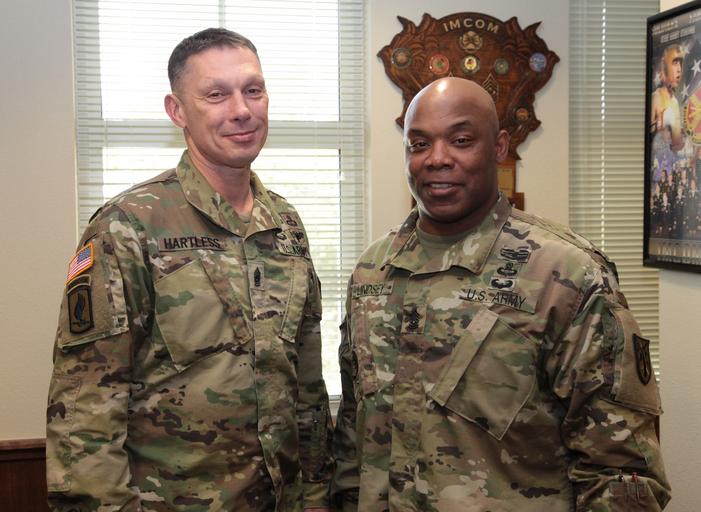 Keywords: people groupshot Command Sgt. Maj. Jeffrey Hartless, of U.S. Army Installation Management Command, meets Command Sgt. Maj. Brian Lindsey, of Fort Sill, Oklahoma, Mar. 16. 2016, at the IMCOM headquarters on Joint Base San Antonio, Texas. (U.S. Army photo by Jessica Ryan.) Command Sgt. Maj. Jeffrey Hartless, of U.S. Army Installation Management Command, meets Command Sgt. Maj. Brian Lindsey, of Fort Sill, Oklahoma, Mar. 16. 2016, at the IMCOM headquarters on Joint Base San Antonio, Texas. (U.S. Army photo by Jessica Ryan.) |