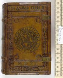 | Keywords: Commentarius de anima - Upper cover (Davis621).jpg Style Armorial Dated Lettered cover eg intitals titles; Caption Upper cover; Colour Brown; Edge Unspecified exhibition history Decorative Technique Tooled in blind Tooled in silver; Cover Material Calf Wooden boards Partly bevelled edges Remnants of two brass clasps on leather thongs The endleaves have a Breslau watermark object history Text 1539; Leipzig; Hess Johann object type Cc-zero place of creation Binding Germany place of discovery See M M Foot The Henry Davis Gift vol II London 1983 British Library image http //www bl uk/catalogues/bookbindings/LargeImage aspx RecordId 020-000004578 ImageId ImageId 41894 Copyright BL Commentarius de anima Uploaded with GWToolset Commentarius de anima - Upper cover Davis621 http //www webarchive org uk/bldatasets/bindings/6469_4 jpg Bookbinding 16th-century bookbinding British Library Bookbindings |