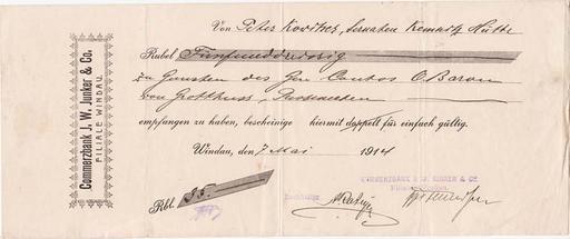 | Keywords: Commerzbank J. W. Junker & Co., Windau Branch. Check (Promissory Note) 35 Rubles 1914.jpg Commercial Joint Stock Bank I W Junker Co Windau now Ventspils Branch Kurland Gubernya Check / Promissory Note 35 RUBLES 1914 F/VF Uniface Black print on paper with watermark Size 293 x 121 mm Комме ческий банк И В Юнке ъ и Ко Виндавское сов Вентспилс отделение Ку ляндская губе ния Чек на 35 ублей 1914 F/VF Uniface Чё ная печать на бумаге с водяными знаками Разме 293 x 121 мм http //www ebay com/itm/1914-Commerzbank-J-W-Junker-Co-WINDAU-Dpt-10-RUBLES-/380316878403 1914 Author PD-RusEmpire Commerzbank I W Junker Co 1914 in Russia Promissory notes History of Ventspils Documents of the Russian Empire |