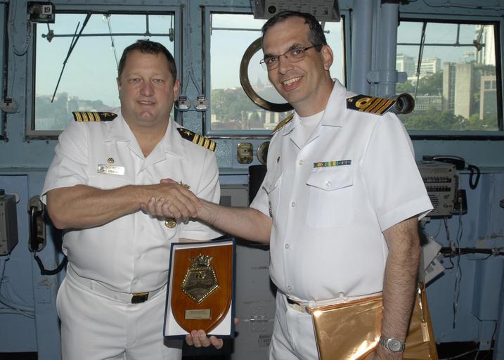 | Keywords: Commodore's Breakfast 090714-N-DW912-018.jpg en Capt Jeferson Scofield commanding officer Rio De Janeiro right presents Capt Brad Williamson commodore Destroyer Squadron TWO with a plaque during Commodore's Breakfast held in the pilot house aboard USS Oak Hill LSD 51 July 14 2009 Oak Hill is participating in a combined multinational exercise Southern Partnership Station SPS '09 SPS '09 is a combined naval and amphibious operation with Oak Hill and maritime forces from Argentina Brazil Chile Peru and Uruguay Oak Hill is also supporting U S Marine Corps Forces South Multinational Amphibious exercise Southern Exchange 2009 U S Navy Photo by Mass Communication 3rd Class Cory Rose/Released 2009-07-14 Petty Officer 2nd Class Cory Rose https //www dvidshub net/image/1583960 090714-N-DW912-018 2014-09-29 17 24 RIO DE JANEIRO BR PD-USGov-Military-Navy USS Oak Hill LSD-51 Images from DoD uploaded by Fæ |
