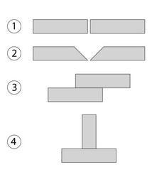 Keywords: Common Joint Types ZP.svg An image of four major types of joints commonly used in welding soldering and brazing applications 1 is a square butt joint 2 is a single V preparation joint 3 is a lap joint and 4 is a T-joint Own 04/03/2008 XcepticZP Welding diagrams