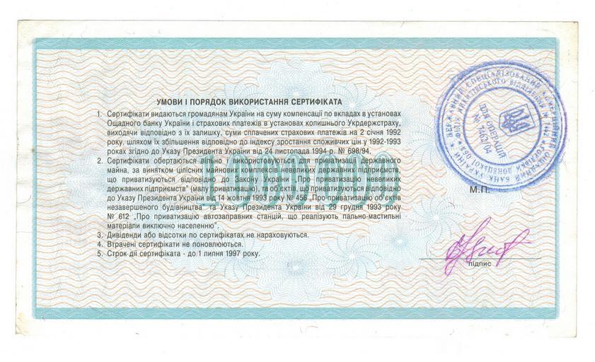 Keywords: Compensation certificate 1b Ukraine 1994 reverse used.jpg Опис Компенсаційний се тифікат на суму індексації г ошових заощаджень г омадян Ук аїни в установах Ощадного банку Ук аїни і колишнього Ук де жст аху Ук аїна 1994/1995 ік омінал 1 мільйон ка бованців Вико истаний Зво отна сто она Авто Dghooo Дже ело з власного а хіву Час ство ення 31 10 2014 Ліцензія PD-UA-exempt Original upload log UWCTransferBot v 2 1 2 based on Chris G's http //toolserver org/~chris/highlight php d chris/classes/ f botclasses php botclasses framework uk wikipedia Compensation+certificate+1b+Ukraine+1994+reverse+used jpg 2014-10-31 19 41 Dghooo 2126×1295×8 1043706 bytes <nowiki> Зоб аження Опис Компенсаційний се тифікат на суму індексації г ошових заощаджень г омадян Ук аїни в установах Ощадного банку Ук аїни </nowiki> Finance Economy of Ukraine |