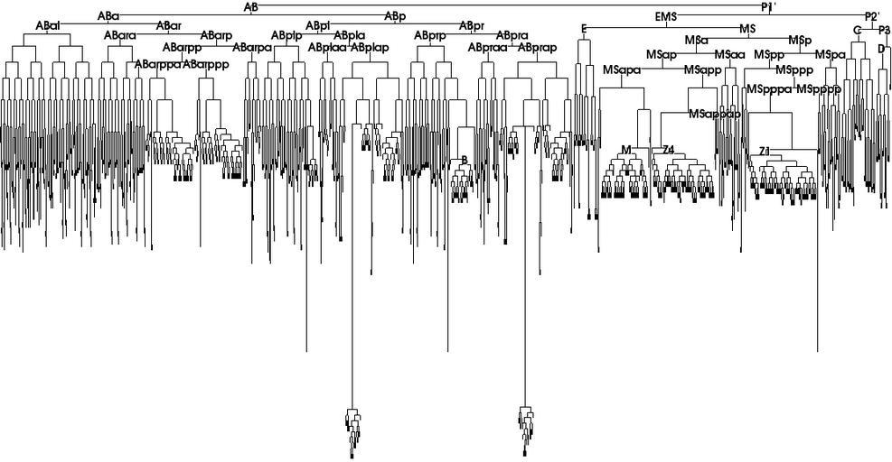 Keywords: Complete cell lineage of C elegans.png en Complete cell lineage of C elegans The history of cellular divisions that sequentially tracks the parents of a particular cell up to its original ancestor the zygote cell is called cell lineage Simple organisms such as the C elegans worm tend to have a deterministic cell lineage meaning that for any given embryo the cells divide following exactly the same pattern More complex organisms tend to have a deterministic lineage only in the early stages of embryogenesis and then as large numbers of cells of similar type are required they tend to generate these cells by following non-deterministic although likely sterotypic patterns Studying the cell lineage of an organism is important because it helps in the understanding of how a particular cell defines its fate in the organism It also helps to understand how mutations and environmental factors may perturb the embryogenesis process and result in malformed organisms In the context of studying gene functionality the cell lineage also provides a baseline layer upon which the behavior of genes can be laid out across space and time as the organism develops https //cfwebprod sandia gov/cfdocs/CCIM/docs/VDA2008CellLineage pdf Integration of Information and Volume Visualization pdf file Andrej Cedilnika Jeffrey Baumesb Luis Ibanezb Sean Megasonc and Brian Wylied 2008 PD-USGov Information visualization Tree diagrams Caenorhabditis elegans Developmental biology Cell differentiation |