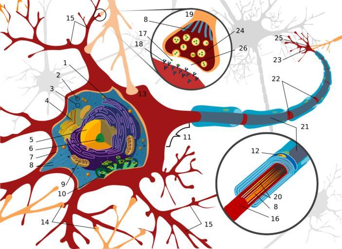 | Keywords: Complete neuron cell diagram numbered.svg Complete neuron cell diagram Neurons also known as neurones and nerve cells are electrically excitable cells in the nervous system that process and transmit information In vertebrate animals neurons are the core components of the brain spinal cord and peripheral nerves it Diagramma completo di una cellula neuronale <table><tr> <br>1 Reticolo endoplasmatico rugoso corpo di Nissl <br>2 Poliribosomi <br>3 Ribosomi <br>4 Apparato Golgi <br>5 Nucleo <br>6 Nucleolo <br>7 Membrana <br>8 Microtubuli <br>9 Mitocondrio <br>10 Reticolo endoplasmatico liscio <br>11 Cono di emergenza assone <br>12 Nucleo cellula di Schwann <br>13 Sinapsi assone somatico <br>14 Sinapsi assone dendritico <br>15 Dendriti <br>16 Assone <br>17 Neurotrasmettitore <br>18 Recettore <br>19 Sinapsi <br>20 Microfilamenti <br>21 Guaina mielinica cellula di Schwann <br>22 Nodo di Ranvier <br>23 Terminale assonale <br>24 Vescicole assonali <br>25 Sinapsi assone assone <br>26 Distanza sinaptica </tr></table> Own work Image renamed from Image Complete neuron diagram numbered svg 2007-07-12 LadyofHats LadyofHats Complete neuron cell diagram without text svg Other versions/Complete neuron cell diagram Neurobiology Diagrams labelled with numbers only Neurons Histological schematic Anatomical plates and drawings of the human nervous system |