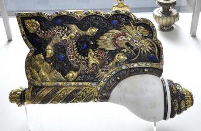 MAKE A MEME View Large Image Tibet BM 1992 1214 16.jpg Trumpet Made of conch shell with copper gilt copper alloy and semi precious stones Metal pendant with dragon motif Used in the monastic orchestra Tibet 18th/19th century 44 x 25 cm Room 33 own own photograph ...