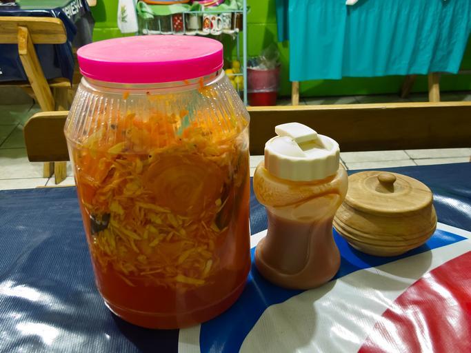 | Keywords: Condiments for Pupusas in El Salvador 2012.jpg en Condiments for Pupusas typical for El Salvador This photo here was taken in Olocuilta La Paz El Salvador Large container at left is the vingared cabbage curtido tomato sauce in the middle Wooden sugar bowl at right has sugar for coffee es Condimentos para pupusas aquí en Olocuilta La Paz El Salvador A la izquierda curtido en el medio salsa de tomate La fuente de madera tiene azúcar para café own Ll1324 13 563435 -89 116424 Pupusa Curtido Cc-zero |
