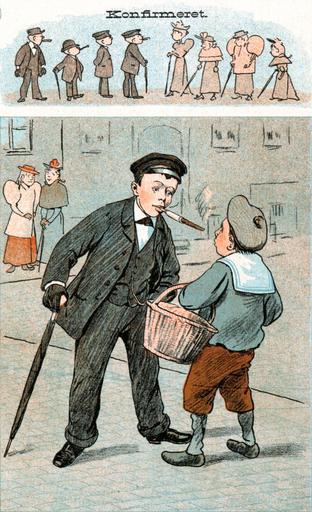 | Keywords: Confirmationed1894page324Puk.jpg  The one boy is grown-up and is a man and the pal is only a boy 1894 caricature from the Danish Puk magazine showing teen-agers immediately adopting inappropriately adult manners after their confirmation a religious ceremony which to some degree marked one's coming of age in that time PD-old Fashion in 1894 Adolescence religious caricatures Confirmation in art Smoking men in art Boys in art Caricatures of teenagers Puk magazine Sailor suits in art Smoking boys in art Images by Haabet People in 1894 1894 in Denmark Teenagers in Denmark Quarrels 1894 cartoons |