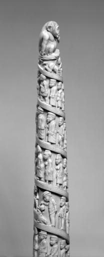 Keywords: Congolese - Elephant Tusk with Scenes of African life - Walters 71586 - View C.jpg The tusk is carved in high relief with a procession of figures in a rising spiral It is thought to have been carved by the Vili people of Loango for the French traders who dominated the area The scenes which read from the bottom show a war between two African peoples in which the defeated are roped and led away; a sailor woodworking; coconuts being picked; a trader selling gin; prisoners being led off for sale as slaves; a European lighting his cigar; fishermen carrying large fish; a procession of dignitaries; the execution of criminals; goods and ivory being brought for sale; another procession of dignitaries who salute a European in a wicker chair; the preparing of a pig and other food for a banquet; a procession; the arrest of a wrong-doer; a procession; and an execution The top is carved with a gorilla eating a banana and scratching his side The costumes suggest a mid-century date and the Africans in the procession are shown in printed European cotton textiles There are many distinctions in rank among the Africans as indicated by their costume hats and jewelry and by specific symbols for example an umbrella Other similar tusks are known the earliest of which was purchased between 1839 and 1867 by the French admiral Fleuriot de Langle between 1850 1860 ivory cm 108 22 4 10 1 accession number 71 586 10458 Tiffany Company New York date and mode of acquisition unknown Henry Walters Baltimore ca 1910 by purchase Walters Art Museum Henry Walters Acquired by Henry Walters ca 1910 Through African Eyes The European in African Art 1500-Present The Detroit Institute of Arts Detroit; The Nelson-Atkins Museum of Art Kansas City 2010-2011 place of origin Loango Congo Walters Art Museum license Art of the Congo Basin African ivory Collections of the Walters Art Museum Media contributed by the Walters Art Museum needs category review