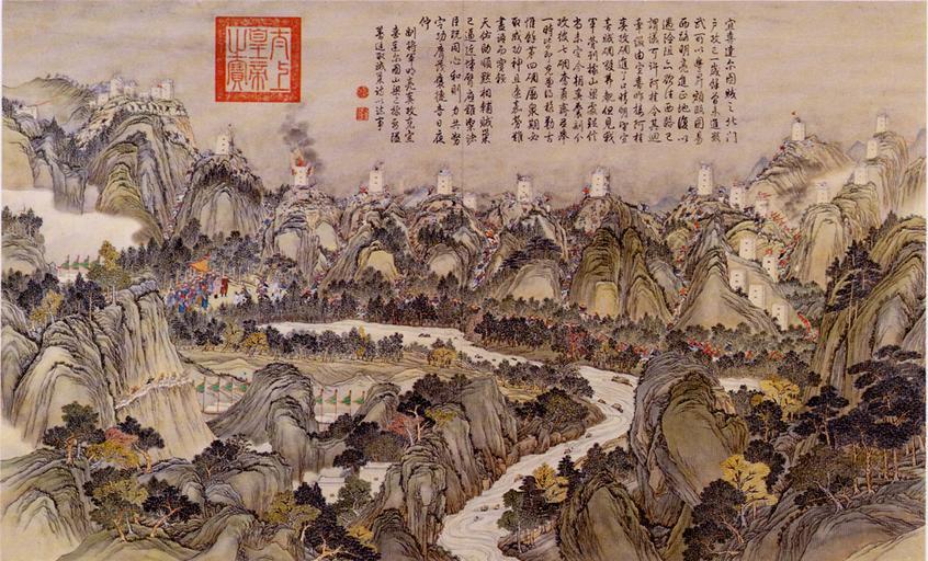 | Keywords: Conquest of the mountain range at Yixi and Daertu.jpg en Conquest of the mountain range at Yixi and Daertu a scene of the Jinchuan Campaign 1771-1776 zh-hans 平定两金 战役之 攻克 达尔图山梁 http //www battle-of-qurman com cn/e/hist htm late XVIII century A collaboration between Chinese and European painters The Jesuit missionaries involved in producing the drawings in China were Giuseppe Castiglione Jean-Denis Attiret Ignace Sichelbart and Jean Damascene The engravings were executed in Paris under the direction of Charles-Nicolas Cochin of the Académie Royal at the Court of Louis XVI and the individual engravers include Le Bas Aliamet Prevot Saint-Aubin Masquelier Choffard and Launay PD-Art Military of Qing China Ten Great Campaigns Paintings of the Qing Dynasty |