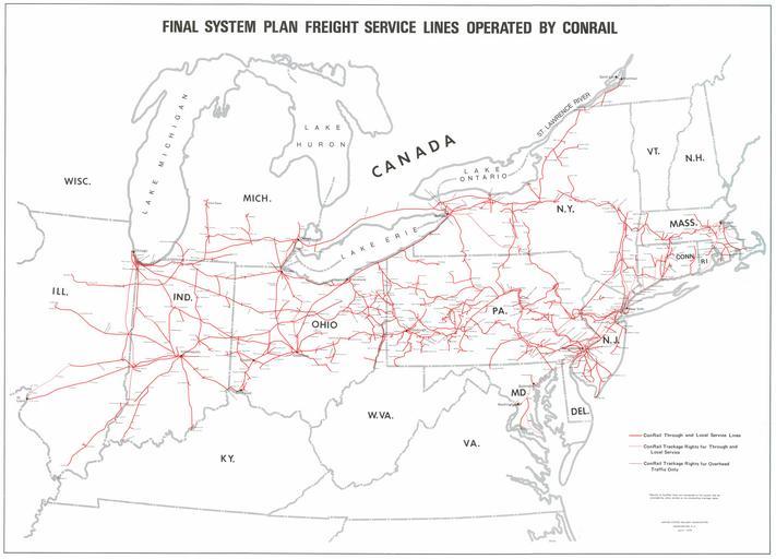 Keywords: Conrail FSP Freight Lines Map 1975.jpg LargeImage Map of Final System Plan Freight Service Lines Operated by Conrail Plan formulated by United States Railway Association http //multimodalways org/archives/govts/federal/executive/agencies/DOT/USRAII/FSP/FSP html United States Railway Administration Final System Plan 1975-07 United States Railway Association Washington DC PD-USGov File Conrail FSP Freight Lines Map 1975 svg Conrail System maps of defunct U S railroads |