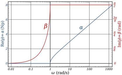 | Keywords: Constant-k Filter Transmission Parameters.svg transmission parameters <math>\gamma \alpha + i \beta</math> of a prototype low-pass constant-k filter of a single half-section <br> <math>\gamma \alpha + i \beta \begin cases 0 + \sin -1 \frac \omega \omega_c \omega < \omega_c \\ \cosh -1 \frac \omega \omega_c + i \frac \pi 2 \omega > \omega_c \end cases </math> α is measured in nepers and β in radians own Inductiveload 2009-11-23 Mathematica Code <pre><nowiki> l 1; c 1; wc 1/Sqrtl c; gamw_ Piecewise I ArcSinw/wc w < wc ArcCoshw/wc + I Pi/2 w \GreaterSlantEqual wc alphaw_ Regamw; betaw_ Imgamw; LogLinearPlot alphaw betaw w 0 01 10 3 PlotRange -> All PlotPoints -> 1000 </nowiki></pre> Transmission parameters Constant-k filters |