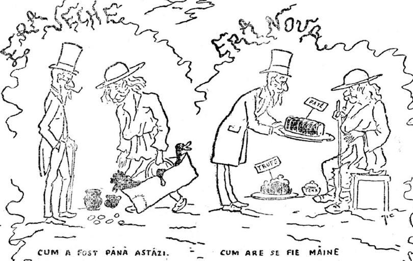 Keywords: Constantin Jiquidi - Era Nouă, Epoca, 28 nov 1888.JPG en Era Nouă The New Era part of a cartoon published in the Romanian newspaper Epoca Reference is made to the political program of Junimea society a liberal-conservative society which in 1888 formed the Romanian government Although not the Prime Minister Junimea leader Petre P Carp coined the term Era Nouă promising a fair deal to the dissatisfied classes mid-way between sweeping reforms and staunch conservatism Epoca represented the classical Conservative group and was tongue-in-cheek about Carp's ideas In these two panels Jiquidi shows Era Veche The Old Era as a time in which the peasant subservience to the landowner and paying his tribute in foodstuffs In the utopian New Era the landowner bows before the peasant presenting him with servings of pâté and truffles Epoca Suplement Ilustrat 903/1888 available through the Bucharest City Library http //digitool dc bmms ro 8881/R/3YEN91RDQHN2LLAT98CMIIVH6GP3F19S45D2I6YYIM6AN3KQEN-00734 func search DacoRomanica archive Creator Constantin Jiquidi 1888-11-28 Political cartoons by Constantin Jiquidi Epoca Romanian newspaper 1888 in Romania 1888 cartoons 1880s political cartoons Pâté Truffle dishes PD-old-100 |