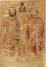 | Keywords: Constantine Palaiologos sebastokrator and Eirene.jpg sebastokrator Constantine Palaiologos and his wife Eirene from the Typikon of the Monastery of Our Lady of Certain Hope Lincoln Typicon Oxford Bodleian Library Lincoln College Ms Gr 35 Cplakidas 1328-1344 PD-old-100 Medieval miniatures of Byzantine emperors Palaiologos dynasty Portrait miniatures of Byzantine Empire Lincoln Typikon Ktitor Illuminated manuscripts in the United Kingdom Ornamental textiles in art Double-headed eagles Konstantinos Palaiologos Byzantine textiles |