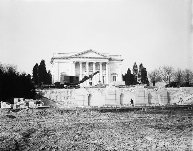| Keywords: Construction on expanded Tomb of the Unknown Soldier - Arlington National Cemetery - Arlington County VA USA - 1931.jpg en Construction on the expansion of Memorial Amphitheater's grounds to accommodate the larger Tomb of the Unknown Soldier in Arlington National Cemetery in Arlington County Virginia in the United States Image was taken in 1931 Memorial Amphitheater can be seen in the background As constructed in 1920 Memorial Amphitheater ended in a small plaza atop a retaining wall with a granite balustrade on the edge The following year the Tomb of the Unknown Soldier was added to this plaza But the tomb was originally just a flat marble slab awaiting an appropriate monument In 1926 Congress authorized the construction of a larger tomb cenotaph Design work on and quarrying of this marble block took several years The block was emplaced in 1931 As part of the new tomb the balustrade was removed as can be seen in this photograph The retaining wall too was removed and replaced with monumental stairs leading down to the formal Italiante garden below LOC-image hec 36262 Harris Ewing 1931 1 negative glass 4 x 5 in or smaller accession number Reproduction Number LC-DIG-hec-36262 digital file from original negative Call Number LC-H2- B-4493 P P institution Library of Congress Prints and Photographs Division Washington D C 20540 USA http //hdl loc gov/loc pnp/pp print Title devised by Library staff Date based on date of negatives in same range Gift; Harris Ewing Inc 1955 General information about the Harris Ewing Collection is available at http //hdl loc gov/loc pnp/pp hec Rights Advisory No known restrictions on publication PD-Harris-Ewing Tomb of the Unknowns |