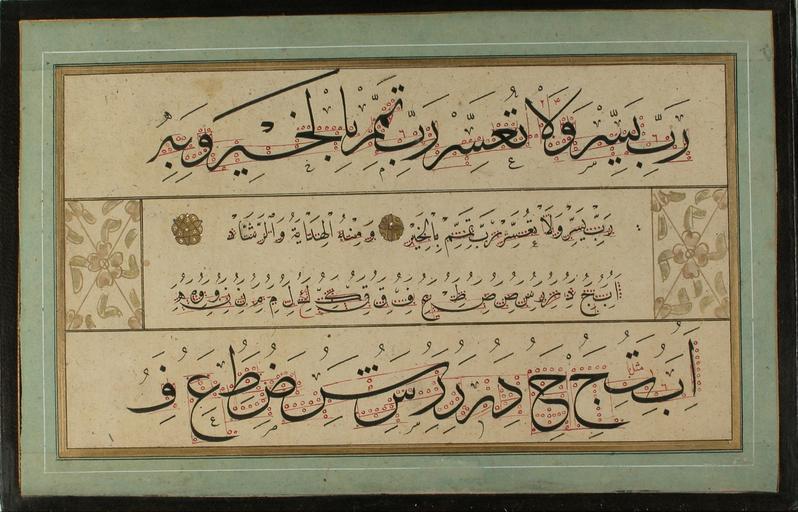 Keywords: Containing Mehmed Şevki Efendi's calligraphies - Murakka (calligraphic album) - Google Art Project.jpg Top Arabic line reads رب يسر ولا تعسر رب تمم بالخير وبه 1829 Containing 602088 Mehmed Şevki Efendi's calligraphies 1829 /collection/sakp-sabanc-museum/artwork/murakka-calligraphic-album-containing-mehmed-sevki-efendis-calligraphies/574847/ Containing Mehmed Şevki Efendi's calligraphies /artist/mehmed-sevki-efendi/4127420/ 4127420 /collection/sakp-sabanc-museum/ Sakıp Sabancı Museum 479109 http //muze sabanciuniv edu/ 12/28/2011 6 21 34 PM /collection/sakp-sabanc-museum/artwork/murakka-calligraphic-album-containing-mehmed-sevki-efendis-calligraphies/574847/ 1863 1863 168 574847 False 1863 3/24/2012 5 16 41 AM 120-0216-MS Sakıp Sabancı Museum Ink colours and gold on paper pasted on cardboard 1860 1870 w258 x h168 mm 1863 False 1 5609756097561 Sakıp Sabancı Museum Object murakka-calligraphic-album-containing-mehmed-sevki-efendis-calligraphies Murakka calligraphic album m 258 special url_id NAGDVST4V0GoXw PD-old-70-1923 Google Art Project works by Mehmed Şevki Efendi Islamic calligraphy