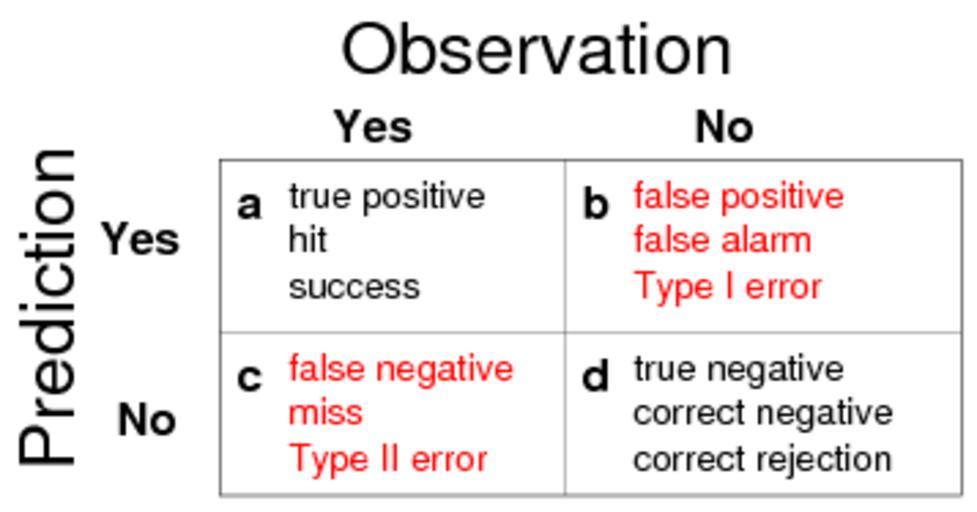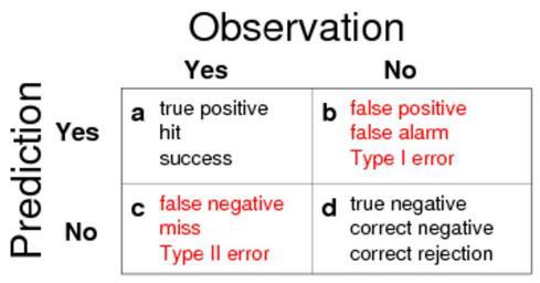 Keywords: Contingency table.png en Contingency table in standard form and labelling showing the four possibilities of an event being predicted forecast or not and occurring observed or not with some of the more common terms for each outcome own J Johnson 2012-08 Derived in accordance with the following authorities citation Jolliffe Ian T Stephenson David B 2003 Forecast Veriļ¬cation A Practitioner s Guide in Atmospheric Science 1st John Wiley Sons Ltd 0-471-49759-2 Table 3 2; citation Nurmi Pertti December 2003 Recommendations on the verification of local weather forecasts European Centre for Medium Range Weather Forecasts ECMWF Technical Memorandum 430 http //www eumetcal org/resources/ukmeteocal/verificationSAV/www/english/msg/library/TechnicalMemorandum430 pdf p 9; citation Zechar Jeremy Douglas August 2008 Methods for Evaluating Earthquake Prediction dissertation Univ of Southern California http //earth usc edu/~zechar/zechar_dissertation pdf figure 3 2 Forecasting Uncategorized 2014 July 28 |