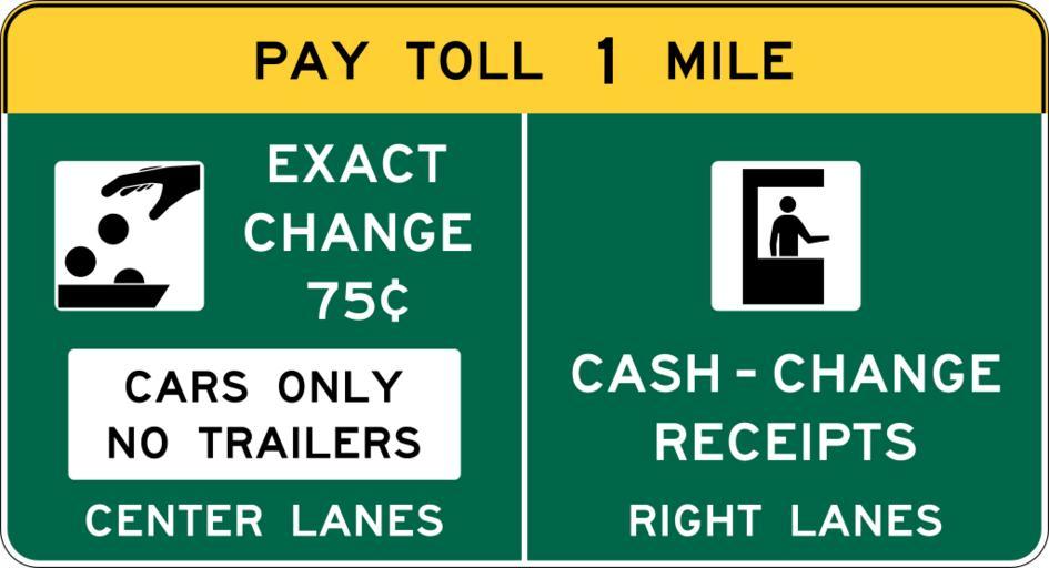 | Keywords: Conventional Toll Plaza Advance Sign 2.svg en Conventional Toll Plaza Advance Sign from the 2009 MUTDC 2009 MUTDC p 248 Department of Transportation 2009 PD-USGov Diagrams of guide signs in Delaware Diagrams of guide signs in Maryland Diagrams of guide signs in New Jersey |