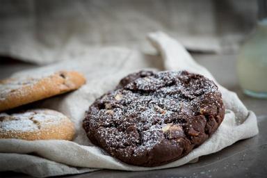 Keywords: cookie dark cookie chocolate cookie schokocookie food baked food nutrition delicious eat frisch bakery sweet pastries food-photography small cakes close chocolate chip cookies baked goods treat chocolate fine pastry nibble even baked calories edible icing sugar sweetness