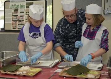 | Keywords: Cooking contest 140418-N-OX321-115.jpg en Culinary Specialist 2nd Class Robert Schwarz of Naval Air Facility NAF Atsugi's Far East Cafe assists participants during NAF Atsugi's Top Little Chef Sushi Challenge The event consisted of nine children from Shirley Lanham Elementary School and was part of the Month of the Military Child celebration Participants were judged on their presentation use of ingredients and final taste with the grand prize winner receiving a Far East Cafe short sleeved chef's coat U S Navy photo by Mass Communication Specialist 2nd Class Kegan E Kay/Released <br>Unit Naval Air Facility Atsugi 2014-04-18 Petty Officer 2nd Class Kegan Kay https //www dvidshub net/image/1257193/cooking-contest 140418-N-OX321-115 2014-04-18 04 37 ATSUGI JP PD-USGov-Military-Navy Naval Air Facility Atsugi Images from DoD uploaded by Fæ |