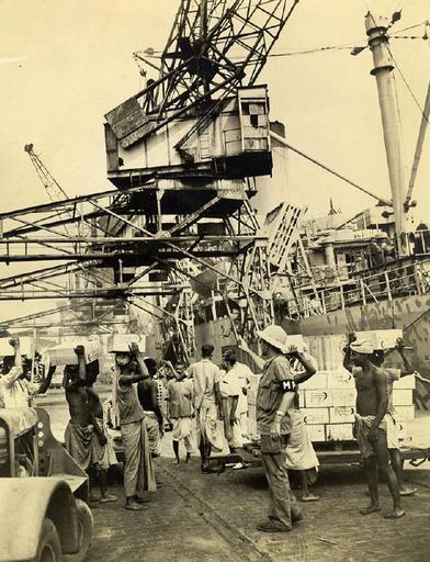 Keywords: Coolies carry rations at Calcutta Docks in 1945.jpg GI dock workers of the Port comapanies created order out of cahos at Calcutta's great docks and thousands of tons of vital war supplies flowed through to china Burma and India The MP is on hand to see that the coolies do not pilfer from the rations they are carrying The South Asia Section of the Van Pelt Library University of Pennsylvania recently acquired from a bookdealer a photograph album consisting of 60 photographs of Calcutta taken most likely between 1945-1946 The photographer Mr Clyde Waddell also provided the interesting glosses accompanying each photograph Several attested copies of this work has emerged including one with a 'title page' held by the Southeastern Louisiana University in Hammond Louisiana Mr Waddell was a military photographer Many of his captions sound like annotations that would be found in a typical military magazine The album begins with several general long shots of Calcutta and ends with a picture of dhobi-s washermen washing clothes The text accompanying the last photograph also sounds as if the author intended to finish with that picture of one of the great mysteries of India The annotations have been included because of their intrinsic interest not only to the photographs but to a 'typical' American impression of India at this time 1945 http //www library upenn edu/collections/sasia/calcutta1947/ Clyde Waddell other versions PD-USGov Van Pelt Library University of Pennsylvania - Clyde Waddell Calcutta 1940's photos Uploaded with UploadWizard Coolies in India Port of Kolkata |