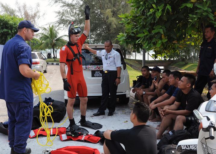 Keywords: Cooperation Afloat Readiness and Training 2012 120616-N-KB052-055.jpg en U S Coast Guard Seaman Ian Butler surface rescue swimmer assigned to the Legend-class national security cutter USCGC Waesche WMSL 751 demonstrates proper rescue swimmer hand signals to members of the Malaysia Maritime Enforcement Agency during a survival swimming and dive technique training event The event is part of Cooperation Afloat Readiness and Training Malaysia 2012 CARAT is a series of bilateral military exercises between the U S Navy and the armed forces of Bangladesh Brunei Cambodia Indonesia Malaysia the Philippines Singapore and Thailand Timor Leste joins CARAT for the first time in 2012 U S Navy photo by Mass Communication Specialist 1st Class N Ross Taylor/Released 2012-06-16 Petty Officer 1st Class Ross Taylor https //www dvidshub net/image/605595 120616-N-KB052-055 2012-06-17 12 11 LUMUT MY PD-USGov-Military-Navy USCGC Waesche WMSL-751 Cooperation Afloat Readiness and Training 2012 Images from DoD uploaded by Fæ |