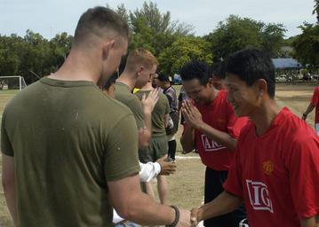 | Keywords: Cooperation Readiness Afloat and Training Thailand 2009 DVIDS187803.jpg en U S Marines embarked aboard the dock landing ship USS Harpers Ferry greet opposing Thai soccer players during a sports day for Cooperation Readiness Afloat and Training Thailand 2009 CARAT is a series of bilateral exercises held annually in Southeast Asia to strengthen relationships and enhance the operational readiness of the participating forces 2009-07-12 Petty Officer 2nd Class Jason Tross https //www dvidshub net/image/187803 090712-N-+++++-183 2009-07-15 23 17 SATTAHIP TH PD-USGov-Military-Navy Sattahip Images from DoD uploaded by Fæ |