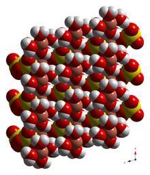 | Keywords: Copper(II)-sulfate-pentahydrate-b-axis-xtal-2007-CM-3D-sf.png Space-filling diagram of part of the crystal structure of copper II sulfate pentahydrate CuSO<sub>4</sub>·5H<sub>2</sub>O Viewed down the b axis of the triclinic unit cell Colour code Copper Cu orange-pink Sulfur S yellow Oxygen O red Hydrogen H white Crystal structure from http //dx doi org/10 2138/am 2007 2229 American Mineralogist 2007 92 532 “545 Image generated in http //www crystalmaker com/ CrystalMaker 8 3 Own 2010-07-26 Ben Mills Benjah-bmm27 Images by Ben Mills Space-filling models Crystal structures of copper II sulfate pentahydrate |