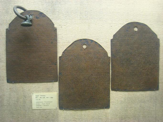 Keywords: Copper plates NMND-2.JPG Achyutaraya Vijayanagar Sanskrit in Nandinagari script 1537 AD Copper plates exhibited in the National Museum New Delhi India own 2010-09-02 Daderot Public domain Copper plates in National Museum New Delhi Nandinagari Achyutaraya Temple |