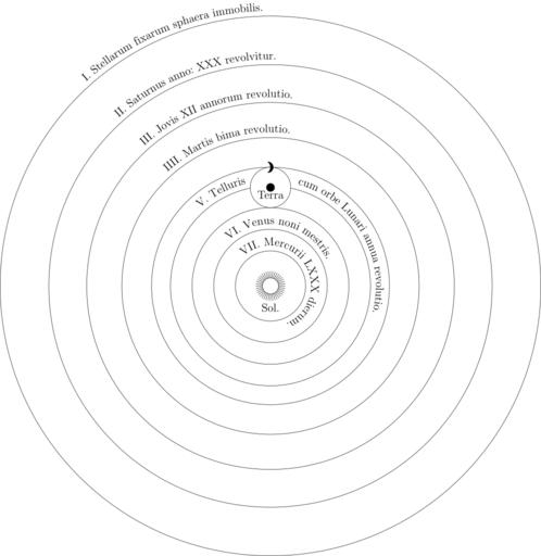 | Keywords: Coppernicus 002.svg de à ber die Kreisbewegungen der Weltkörper 2 File Kreisbewegungen-Coppernicus-0 djvu p 27 1879 w Nicolaus Copernicus File Coppernicus2 png PD-old-100 De revolutionibus drawings LaTeX Source Code <syntaxhighlight lang latex > complile with »pdflatex« \documentclasstikz convert pdf2svg standalone \usetikzlibrary decorations text \begin document \begin tikzpicture \draw 0 0 circleradius 10; \draw decorate decoration text along path text \large I Stellarum fixarum sphaera immobilis 0 0 ++ 132 10 2 arc 132 80 10 2cm ; \draw 0 0 circleradius 8 2; \draw decorate decoration text along path text \large II Saturnus anno XXX revolvitur 0 0 ++ 132 8 4 arc 132 80 8 4cm ; \draw 0 0 circleradius 6 8; \draw decorate decoration text along path text \large III Jovis XII annorum revolutio 0 0 ++ 132 7 0 arc 132 70 7 0cm ; \draw 0 0 circleradius 5 5; \draw decorate decoration text along path text \large IIII Martis bima revolutio 0 0 ++ 132 5 7 arc 132 70 5 7cm ; \draw 0 0 circleradius 4 4; \draw 0 0 circleradius 3 7; \draw decorate decoration text along path text \large V Telluris 0 0 ++ 132 3 9 arc 132 70 3 9cm ; \draw decorate decoration text along path text \large cum orbe Lunari annua revolutio 0 0 ++ 75 3 9 arc 75 -70 3 9cm ; \draw fill white 0 3 65 nodebelow \large Terra circleradius 0 75; \draw fill 0 3 65 circleradius 0 15; \pgfmathsetmacro \MyAlpha asin 0 8 \draw fill -0 1 4 6 arc 90 -90 0 2 arc -\MyAlpha \MyAlpha 0 25 -- cycle; \draw 0 0 circleradius 2 9; \draw 0 0 circleradius 2 1; \draw decorate decoration text along path text \large VI Venus noni mestris 0 0 ++ 132 2 3 arc 132 0 2 3cm ; \draw 0 0 circleradius 1 3; \draw decorate decoration text along path text \large VII Mercurii LXXX dierum 0 0 ++ 132 1 5 arc 132 -90 1 5cm ; \draw 0 0 circleradius 0 3; \foreach \a in 9 18 360 \draw 0 0 ++ \a 0 3 -- \a 0 55 ; \draw 0 -0 8 node \large Sol ; \end tikzpicture \end document </syntaxhighlight> |