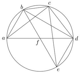 Keywords: Coppernicus 009.svg de à ber die Kreisbewegungen der Weltkörper 9 File Kreisbewegungen-Coppernicus-0 djvu p 35 1879 w Nicolaus Copernicus File Coppernicus9 png PD-old-100 De revolutionibus drawings LaTeX Source Code <syntaxhighlight lang latex > complile with »pdflatex« \documentclasstikz convert pdf2svg standalone \begin document \begin tikzpicture \draw 0 0 circleradius 2; \pgfmathsetmacro \BFA 120 ; \coordinate A at 180 2 ; \coordinate B at \BFA 2 ; \coordinate C at 75 2 ; \coordinate D at 0 2 ; \coordinate E at \BFA-180 2 ; \draw A -- B ; \draw B -- C ; \draw C -- D ; \draw D -- E ; \draw A -- C ; \draw A -- D ; \draw B -- D ; \draw B -- E ; \draw C -- E ; \draw A + 180 0 2 node a ; \draw B + \BFA 0 2 node b ; \draw C + 75 0 2 node c ; \draw D + 0 0 2 node d ; \draw E + \BFA-180 0 2 node e ; \draw 0 0 + \BFA/2-180 0 3 node f ; \end tikzpicture \end document </syntaxhighlight>