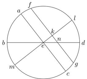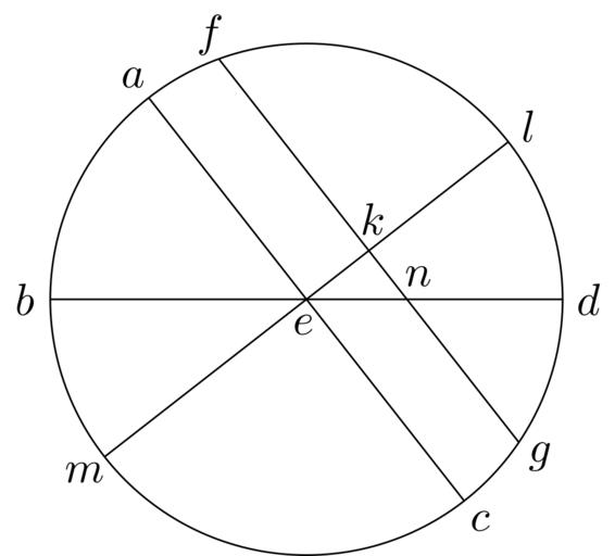 | Keywords: Coppernicus 036.svg de à ber die Kreisbewegungen der Weltkörper 36 File Kreisbewegungen-Coppernicus-0 djvu p 72 1879 w Nicolaus Copernicus File Coppernicus_036 png PD-old-100 De revolutionibus drawings LaTeX Source Code <syntaxhighlight lang latex > complile with »pdflatex« \documentclasstikz convert pdf2svg standalone \usetikzlibrary intersections \begin document \begin tikzpicture \draw 0 0 circleradius 2; \pgfmathsetmacro \DEL 38 ; \pgfmathsetmacro \FEA 18 ; \coordinate A at \DEL+90 2 ; \coordinate B at 180 2 ; \coordinate C at \DEL-90 2 ; \coordinate D at 0 2 ; \coordinate E at 0 0 ; \coordinate F at \DEL+90-\FEA 2 ; \coordinate G at \DEL-90+\FEA 2 ; \coordinate L at \DEL 2 ; \coordinate M at \DEL-180 2 ; \draw A -- C ; \pathdraw name path lineBD B -- D ; \pathdraw name path lineML M -- L ; \pathdraw name path lineFG F -- G ; \pathname intersections of lineML and lineFG name sectionK ; \coordinate K at sectionK-1 ; \pathname intersections of lineBD and lineFG name sectionN ; \coordinate N at sectionN-1 ; \draw A + \DEL+90 0 2 node a ; \draw B + 180 0 2 node b ; \draw C + \DEL-90 0 2 node c ; \draw D + 0 0 2 node d ; \draw E + \DEL-135 0 2 node e ; \draw F + \DEL+90-\FEA 0 2 node f ; \draw G + \DEL-90+\FEA 0 2 node g ; \draw K + \DEL+45 0 25 node k ; \draw L + \DEL 0 2 node l ; \draw M + \DEL-180 0 2 node m ; \draw N + \DEL/2+45 0 2 node n ; \end tikzpicture \end document </syntaxhighlight> |