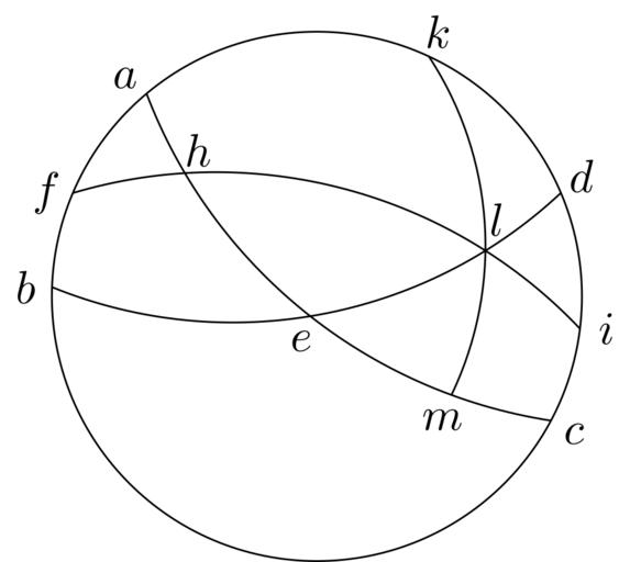 | Keywords: Coppernicus 037.svg  de à ber die Kreisbewegungen der Weltkörper 37 File Kreisbewegungen-Coppernicus-0 djvu p 80 1879 w Nicolaus Copernicus File Coppernicus_037 png PD-old-100 De revolutionibus drawings LaTeX Source Code <syntaxhighlight lang latex > complile with »pdflatex« \documentclasstikz convert pdf2svg standalone \usepackage tkz-euclide \usetkzobj all \begin document \begin tikzpicture \tkzSetUpLineline width 0 4pt \tkzDefPoint 130 2 A \tkzDefPoint 178 2 B \tkzDefPoint -28 2 C \tkzDefPoint 23 2 D \tkzDefPoint 0 0 E' \tkzDefPoint -0 05 -0 15 E \tkzDefPoint 157 2 F \tkzDefPoint -7 2 I \tkzDefPoint 65 2 K \begin pgfinterruptboundingbox \tkzCircumCenter A E C \tkzGetPoint O1 \tkzCircumCenter B E D \tkzGetPoint O2 \end pgfinterruptboundingbox \tkzDefPointByrotation center O1 angle 18 E \tkzGetPoint M \tkzDefPointByrotation center O2 angle 22 5 E \tkzGetPoint L \begin pgfinterruptboundingbox \tkzCircumCenter K L M \tkzGetPoint O3 \tkzCircumCenter F L I \tkzGetPoint O4 \tkzInterCC O1 A O4 I \tkzGetPoints H2 H \end pgfinterruptboundingbox \tkzDrawCircle E' A \tkzDrawArccolor black O1 A C \tkzDrawArccolor black O2 B D \tkzDrawArccolor black O3 M K \tkzDrawArccolor black O4 I F \draw A + 144 0 2 node a ; \draw B + 180 0 2 node b ; \draw C + -30 0 2 node c ; \draw D + 40 0 2 node d ; \draw E + -110 0 2 node e ; \draw F + 180 0 2 node f ; \draw H + 60 0 2 node h ; \draw I + 0 0 2 node i ; \draw K + 70 0 2 node k ; \draw L + 70 0 25 node l ; \draw M + -110 0 2 node m ; \end tikzpicture \end document </syntaxhighlight> |