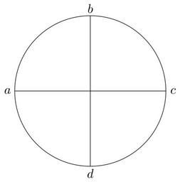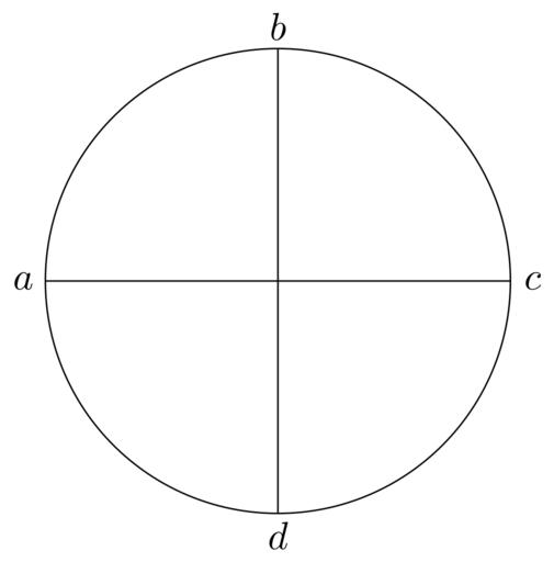 Keywords: Coppernicus 045.svg de à ber die Kreisbewegungen der Weltkörper 45 File Kreisbewegungen-Coppernicus-0 djvu p 141 1879 w Nicolaus Copernicus File Coppernicus_045 png PD-old-100 De revolutionibus drawings LaTeX Source Code <syntaxhighlight lang latex > complile with »pdflatex« \documentclasstikz convert pdf2svg standalone \begin document \begin tikzpicture \pgfmathsetmacro \radius 2 1 ; \draw 0 0 circleradius \radius; \coordinate A at 180 \radius ; \coordinate B at 90 \radius ; \coordinate C at 0 \radius ; \coordinate D at -90 \radius ; \draw A -- C ; \draw B -- D ; \draw A + 180 0 2 node a ; \draw B + 90 0 2 node b ; \draw C + 0 0 2 node c ; \draw D + -90 0 2 node d ; \end tikzpicture \end document </syntaxhighlight>