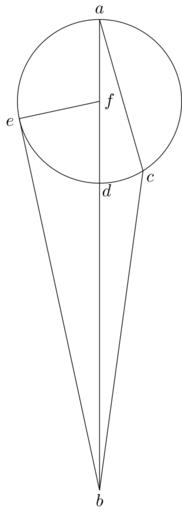 | Keywords: Coppernicus 065.svg de à ber die Kreisbewegungen der Weltkörper 65 File Kreisbewegungen-Coppernicus-0 djvu p 183 1879 w Nicolaus Copernicus File Coppernicus_065 png PD-old-100 De revolutionibus drawings LaTeX Source Code <syntaxhighlight lang latex > complile with »pdflatex« \documentclasstikz convert pdf2svg standalone \usepackage tkz-euclide \usetkzobj all \begin document \begin tikzpicture \tkzSetUpLineline width 0 4pt \pgfmathsetmacro \FA 1 65 ; \tkzDefPoint 90 \FA A \tkzDefPoint -90 4 75 \FA B \tkzDefPoint -58 \FA C \tkzDefPoint -90 \FA D \tkzDefPoint 0 0 F \tkzDrawCircle F A \tkzTangentfrom with R B F \FA cm \tkzGetPoints E2 E \draw A -- B ; \draw A -- C ; \draw C -- B ; \draw E -- B ; \draw E -- F ; \draw A + 90 0 2 node a ; \draw B + -90 0 2 node b ; \draw C + -45 0 2 node c ; \draw D + -45 0 2 node d ; \draw E + -160 0 2 node e ; \draw F + 0 0 2 node f ; \end tikzpicture \end document </syntaxhighlight> |