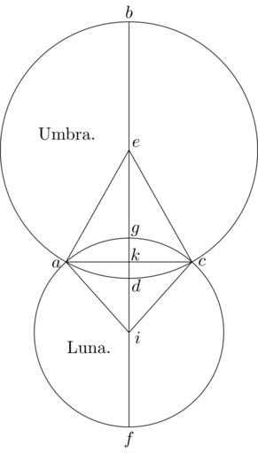 | Keywords: Coppernicus 090.svg de à ber die Kreisbewegungen der Weltkörper 90 File Kreisbewegungen-Coppernicus-0 djvu p 252 1879 w Nicolaus Copernicus File Coppernicus_090 png PD-old-100 De revolutionibus drawings LaTeX Source Code <syntaxhighlight lang latex > complile with »pdflatex« \documentclasstikz convert pdf2svg standalone \usepackage tkz-euclide \usetkzobj all \begin document \begin tikzpicture \tkzSetUpLineline width 0 4pt \pgfmathsetmacro \EB 2 58 ; \pgfmathsetmacro \IF 1 9 ; \tkzDefPoint 90 \EB B \tkzDefPoint 0 0 E \tkzDefPoint 0 -3 67 I \coordinate F at I + -90 \IF ; \coordinate Umbra at E + 165 0 5 \EB ; \coordinate Luna at I + -160 0 45 \IF ; \begin pgfinterruptboundingbox \tkzInterCC E B I F \tkzGetPoints C A \tkzInterLC B F E B \tkzGetPoints B D \tkzInterLC B F I F \tkzGetPoints G F \tkzInterLL B F A C \tkzGetPoint K \end pgfinterruptboundingbox \tkzDrawCircle E B \tkzDrawCircle I F \draw A -- C ; \draw B -- F ; \draw E -- A ; \draw E -- C ; \draw I -- A ; \draw I -- C ; \draw A + -170 0 2 node a ; \draw B + 90 0 2 node b ; \draw C + 0 0 2 node c ; \draw D + -45 0 2 node d ; \draw E + 45 0 2 node e ; \draw F + -90 0 25 node f ; \draw G + 50 0 2 node g ; \draw I + -30 0 2 node i ; \draw K + 50 0 2 node k ; \draw Umbra node Umbra ; \draw Luna node Luna ; \end tikzpicture \end document </syntaxhighlight> |