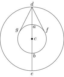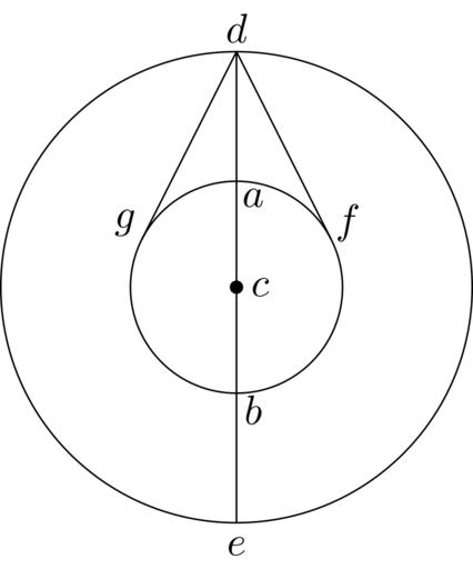 | Keywords: Coppernicus 093.svg de à ber die Kreisbewegungen der Weltkörper 93 File Kreisbewegungen-Coppernicus-0 djvu p 270 1879 w Nicolaus Copernicus File Coppernicus_093 png PD-old-100 De revolutionibus drawings LaTeX Source Code <syntaxhighlight lang latex > complile with »pdflatex« \documentclasstikz convert pdf2svg standalone \usepackage tkz-euclide \usetkzobj all \begin document \begin tikzpicture \tkzSetUpLineline width 0 4pt \pgfmathsetmacro \CD 2 ; \pgfmathsetmacro \dot 0 05 ; \tkzDefPoint 90 0 45 \CD A \tkzDefPoint 0 0 C \tkzDefPoint 90 \CD D \tkzDefPoint -90 \CD E \tkzTangentfrom D C A \tkzGetPoints G F \begin pgfinterruptboundingbox \tkzInterLC D E C A \tkzGetPoints A B \end pgfinterruptboundingbox \tkzDrawCircle C A \tkzDrawCircle C D \drawfill C circleradius \dot; \draw D -- E ; \draw D -- F ; \draw D -- G ; \draw A + -45 0 2 node a ; \draw B + -45 0 2 node b ; \draw C + 0 0 2 node c ; \draw D + 90 0 2 node d ; \draw E + -90 0 2 node e ; \draw F + 45 0 2 node f ; \draw G + 135 0 2 node g ; \end tikzpicture \end document </syntaxhighlight> |