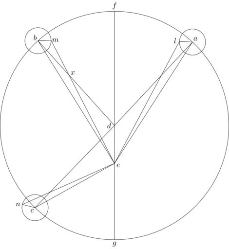 | Keywords: Coppernicus 107.svg de à ber die Kreisbewegungen der Weltkörper 107 File Kreisbewegungen-Coppernicus-0 djvu p 294 1879 w Nicolaus Copernicus File Coppernicus_107 png PD-old-100 De revolutionibus drawings LaTeX Source Code <syntaxhighlight lang latex > complile with »pdflatex« \documentclasstikz convert pdf2svg standalone \usepackage tkz-euclide \usetkzobj all \begin document \begin tikzpicture \tkzSetUpLineline width 0 4pt \pgfmathsetmacro \DA 5 25 ; \pgfmathsetmacro \AN 0 6 ; \tkzDefPoint 47 \DA A \tkzDefPoint 132 \DA B \tkzDefPoint -134 \DA C \tkzDefPoint 0 0 D \tkzDefPoint -90 2 9 \AN E \tkzDefPoint 90 \DA F \tkzDefPoint -90 \DA G \begin pgfinterruptboundingbox \tkzInterLCR D A A \AN cm \tkzGetPoints A1 A2 \tkzInterLCR D B B \AN cm \tkzGetPoints B1 B2 \tkzInterLCR D C C \AN cm \tkzGetPoints C1 C2 \end pgfinterruptboundingbox \tkzDefPointByrotation center A angle -50 A1 \tkzGetPoint L \tkzDefPointByrotation center B angle 50 B1 \tkzGetPoint M \tkzDefPointByrotation center C angle 120 C1 \tkzGetPoint N \tkzInterLL D B E M \tkzGetPoint X \tkzDrawCircle D A \tkzDrawCircle A L \tkzDrawCircle B M \tkzDrawCircle C N \draw F -- G ; \draw D -- A ; \draw D -- B ; \draw D -- C ; \draw E -- A ; \draw E -- L ; \draw A -- L ; \draw E -- B ; \draw E -- M ; \draw B -- M ; \draw E -- C ; \draw E -- N ; \draw C -- N ; \draw A + 47 0 2 node a ; \draw B + 132 0 2 node b ; \draw C + -134 0 2 node c ; \draw D + 180 0 25 node d ; \draw E + -30 0 2 node e ; \draw F + 90 0 25 node f ; \draw G + -90 0 2 node g ; \draw L + 170 0 2 node l ; \draw M + 0 0 2 node m ; \draw N + 180 0 2 node n ; \draw X + 30 0 2 node x ; \end tikzpicture \end document </syntaxhighlight> |