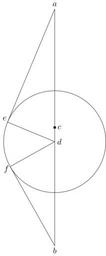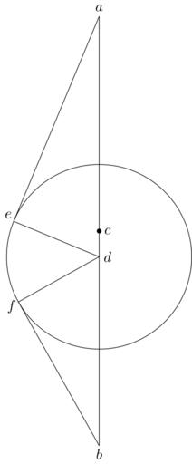 | Keywords: Coppernicus 117.svg de à ber die Kreisbewegungen der Weltkörper 117 File Kreisbewegungen-Coppernicus-0 djvu p 312 1879 w Nicolaus Copernicus File Coppernicus_117 png PD-old-100 De revolutionibus drawings LaTeX Source Code <syntaxhighlight lang latex > complile with »pdflatex« \documentclasstikz convert pdf2svg standalone \usepackage tkz-euclide \usetkzobj all \begin document \begin tikzpicture \tkzSetUpLineline width 0 4pt \pgfmathsetmacro \CB 5 15 ; \pgfmathsetmacro \dot 0 05 ; \tkzDefPoint 90 \CB A \tkzDefPoint -90 \CB B \tkzDefPoint 0 0 C \tkzDefPoint -90 0 12 \CB D \tkzDefPoint -90 0 55 \CB X \tkzTangentfrom B D X \tkzGetPoints F2 F \tkzTangentfrom A D X \tkzGetPoints E E2 \tkzDrawCircle D X \drawfill C circleradius \dot; \draw B -- A ; \draw B -- F ; \draw D -- F ; \draw D -- E ; \draw A -- E ; \draw A + 90 0 2 node a ; \draw B + -90 0 2 node b ; \draw C + 0 0 2 node c ; \draw D + 0 0 2 node d ; \draw E + 130 0 2 node e ; \draw F + -145 0 2 node f ; \end tikzpicture \end document </syntaxhighlight> |