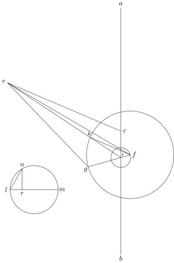 | Keywords: Coppernicus 120.svg de à ber die Kreisbewegungen der Weltkörper 120 File Kreisbewegungen-Coppernicus-0 djvu p 316 1879 w Nicolaus Copernicus File Coppernicus_120 png PD-old-100 De revolutionibus drawings LaTeX Source Code <syntaxhighlight lang latex > complile with »pdflatex« \documentclasstikz convert pdf2svg standalone \usepackage tkz-euclide \usetkzobj all \begin document \begin tikzpicture \tkzSetUpLineline width 0 4pt \pgfmathsetmacro \CA 6 25 ; \pgfmathsetmacro \XL 0 195 \CA ; \tkzDefPoint 90 \CA A \tkzDefPoint -90 \CA B \tkzDefPoint 0 0 C \tkzDefPoint 157 \CA E \tkzDefPoint -90 0 215 \CA I \coordinate F at I + 16 0 08 \CA ; \coordinate F2 at F + 0 0 355 \CA ; \tkzDefPoint -146 0 85 \CA X \coordinate L at X + 180 \XL ; \coordinate N at X + 120 \XL ; \coordinate R at L- N ; \begin pgfinterruptboundingbox \tkzInterLC I E F F2 \tkzGetPoints K2 K \tkzInterLC I F F F2 \tkzGetPoints G G2 \tkzInterLC X L X L \tkzGetPoints M L \tkzInterLC N R X L \tkzGetPoints N2 N \end pgfinterruptboundingbox \tkzDrawCircle I F \tkzDrawCircle F F2 \tkzDrawCircle X L \draw A -- B ; \draw C -- E ; \draw E -- F ; \draw E -- G ; \draw E -- I ; \draw F -- G ; \draw F -- K ; \draw L -- M ; \draw L -- N ; \draw N -- R ; \draw A + 90 0 2 node a ; \draw B + -90 0 2 node b ; \draw C + 0 0 2 node c ; \draw E + 157 0 2 node e ; \draw F + 0 0 2 node f ; \draw G + -130 0 2 node g ; \draw I + 60 0 2 node \footnotesize i ; \draw K + 100 0 2 node \footnotesize k ; \draw L + 180 0 2 node l ; \draw M + 0 0 2 node m ; \draw N + 90 0 2 node n ; \draw R + -90 0 2 node r ; \end tikzpicture \end document </syntaxhighlight> |