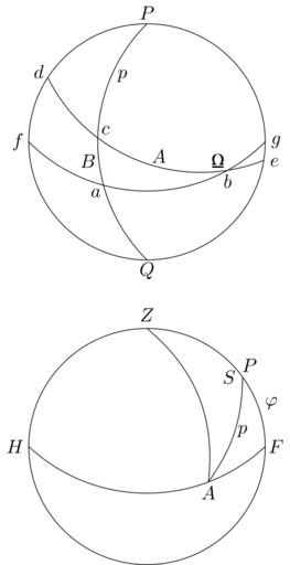 | Keywords: Coppernicus 142.svg de à ber die Kreisbewegungen der Weltkörper 142 File Kreisbewegungen-Coppernicus-0 djvu p 45 Anmerkungen 1879 w Nicolaus Copernicus File Coppernicus_142 png PD-old-100 De revolutionibus drawings LaTeX Source Code <syntaxhighlight lang latex > complile with »pdflatex« \documentclasstikz convert pdf2svg standalone \usepackage marvosym \usepackage tkz-euclide \usetkzobj all \begin document \begin tikzpicture \tkzSetUpLineline width 0 4pt \pgfmathsetmacro \OD 2 17 ; \tkzDefPoint -135 0 52 \OD A \tkzDefPoint 147 \OD D \tkzDefPoint -9 \OD E \tkzDefPoint 180 \OD F \tkzDefPoint 0 \OD G \tkzDefPoint 0 0 O1 \tkzDefPoint 90 \OD P \tkzDefPoint -90 \OD Q \tkzDefPoint 0 -2 58 \OD O2 \coordinate A2 at O2 + -30 0 6 \OD ; \coordinate F2 at O2 + 0 \OD ; \coordinate H2 at O2 + 180 \OD ; \coordinate P2 at O2 + 10 0 75 \OD ; \coordinate PP2 at O2 + 36 \OD ; \coordinate Phi2 at O2 + 18 \OD ; \coordinate Z2 at O2 + 90 \OD ; \begin pgfinterruptboundingbox \tkzCircumCenter F A G \tkzGetPoint FAG \tkzCircumCenter P A Q \tkzGetPoint PAQ \tkzDefPointByrotation center PAQ angle -16 5 A \tkzGetPoint C \tkzCircumCenter D C E \tkzGetPoint DCE \tkzInterCC FAG A DCE C \tkzGetPoints B2 B \tkzDefPointByrotation center PAQ angle 8 C \tkzGetPoint BB \tkzDefPointByrotation center DCE angle 21 C \tkzGetPoint AA \tkzDefPointByrotation center PAQ angle -22 C \tkzGetPoint PP \tkzCircumCenter H2 A2 F2 \tkzGetPoint H2A2F2 \end pgfinterruptboundingbox \tkzDrawCircle O1 D \tkzDrawCircle O2 H2 \tkzDrawArccolor black FAG F G \tkzDrawArccolor black PAQ P Q \tkzDrawArccolor black DCE D E \tkzDrawArccolor black H2A2F2 H2 F2 \draw PP2 to bend left 17 A2 ; \draw Z2 to bend left 28 A2 ; \draw A + -135 0 2 node a ; \draw AA + 60 0 2 node A ; \draw B + -90 0 2 node b ; \draw B + 135 0 25 node \Libra ; \draw BB + 180 0 2 node B ; \draw C + 45 0 2 node c ; \draw D + 147 0 2 node d ; \draw E + -10 0 2 node e ; \draw F + 180 0 2 node f ; \draw G + 0 0 2 node g ; \draw P + 90 0 2 node P ; \draw PP + 0 0 2 node p ; \draw Q + -90 0 2 node Q ; \draw A2 + -90 0 2 node A ; \draw F2 + 0 0 2 node F ; \draw H2 + 180 0 25 node H ; \draw P2 + 0 0 15 node p ; \draw PP2 + 60 0 25 node P ; \draw PP2 + 180 0 25 node S ; \draw Phi2 + 30 0 25 node \varphi ; \draw Z2 + 90 0 25 node Z ; \end tikzpicture \end document </syntaxhighlight> |