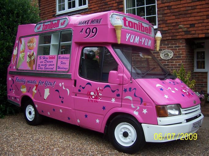 Keywords: Copy of bedford and transit 003.jpg A pink ice cream van own 2009-07-06 Tonibell Pink vans Ice cream vans in the United Kingdom Ford Transit 1986