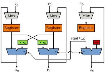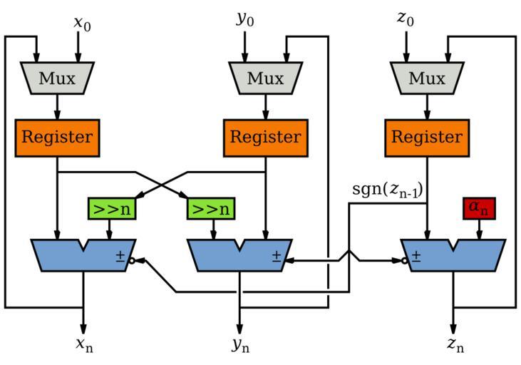 Keywords: CORDIC (Bit-Parallel, Iterative, Circular Rotation).svg en A bit-parallel iterative circular CORDIC Not all control signals and clocking signals are shown Own Inductiveload 2009-06-02 CORDIC